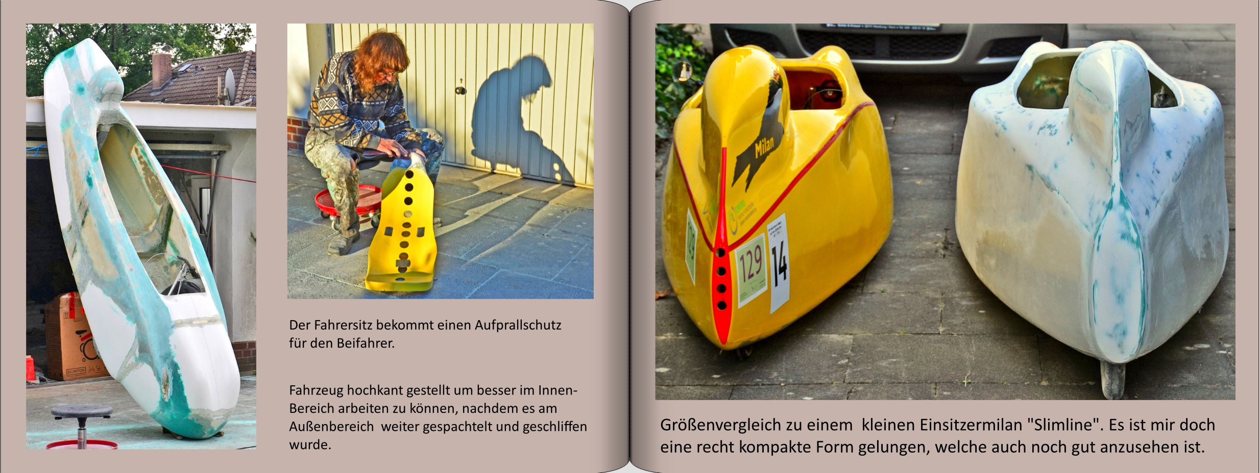 Um so überraschter bin ich über das Fotobuch zur Entstehungsgeschichte des Zweisitzers. So dokumentiert es nicht nur die Machbarkeit des Prinzips, sondern auch dessen Fahrtüchtigkeit. Hinzu kommt, dass es ein aus meinen Augen wunderschönes Fahrzeug geworden ist.